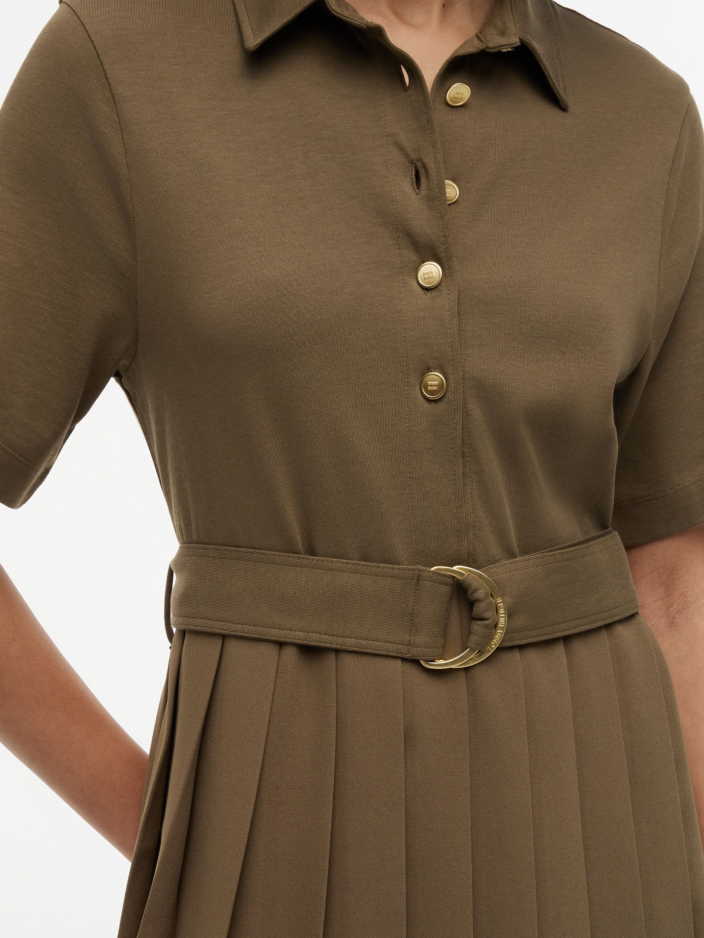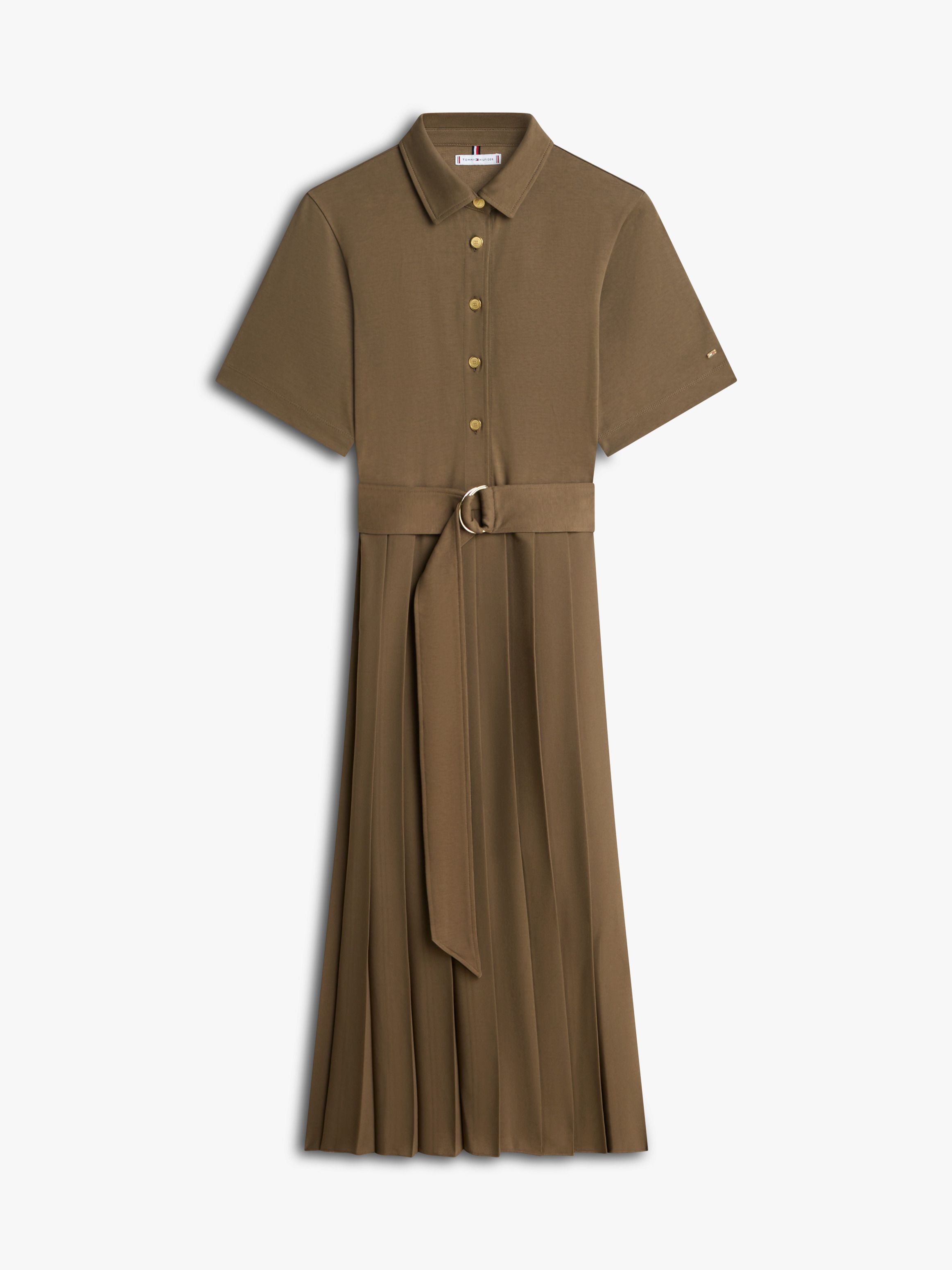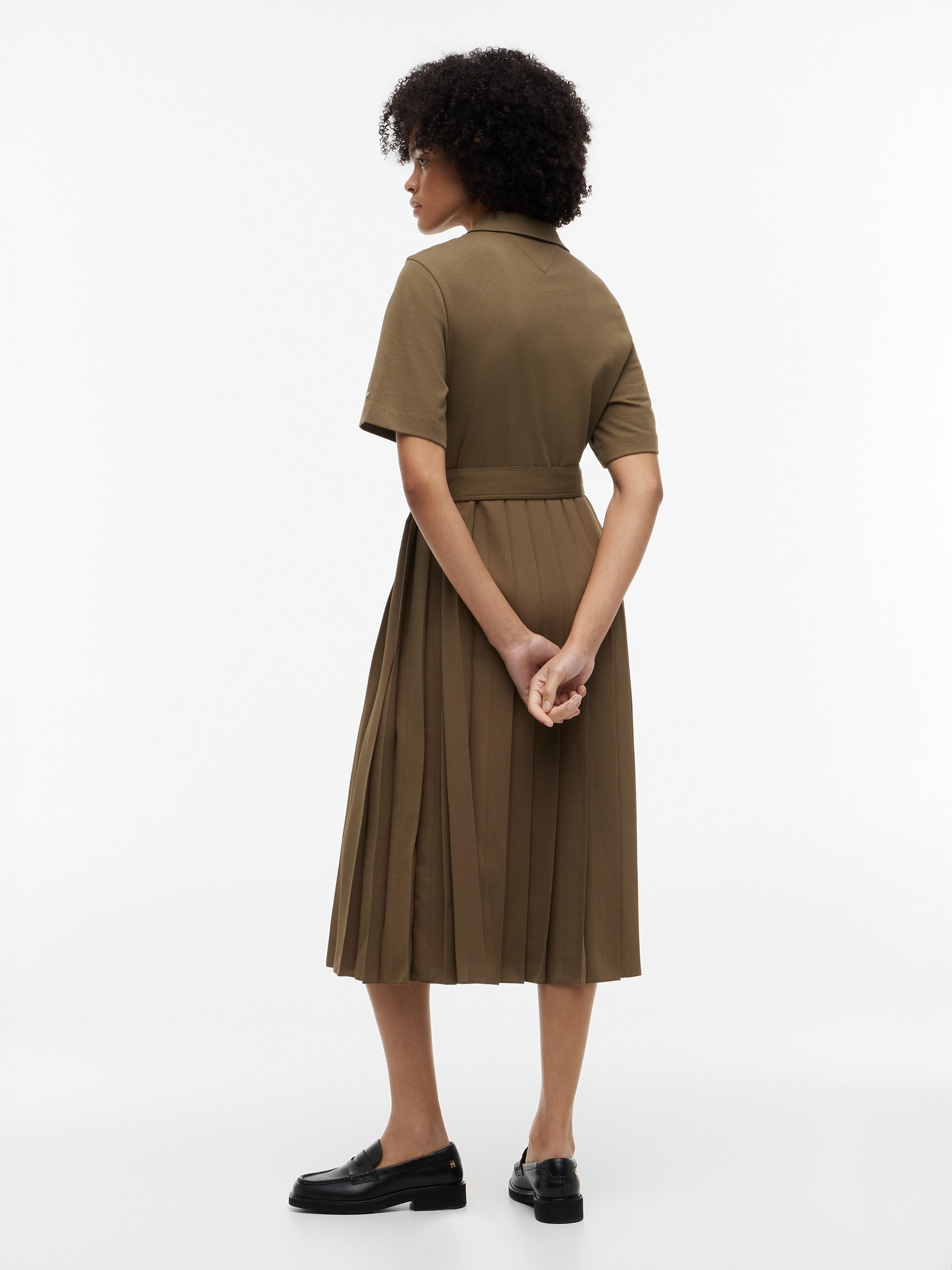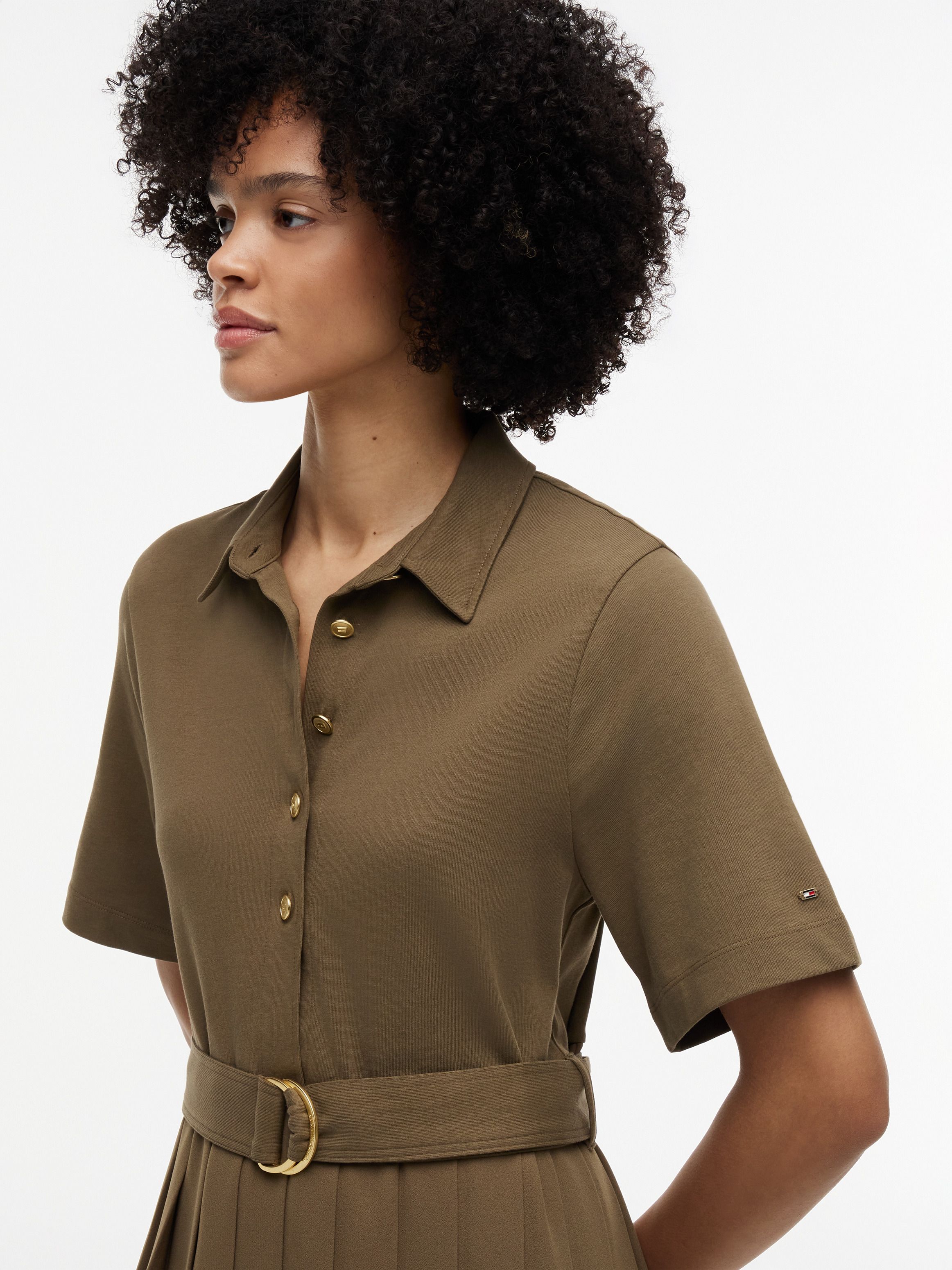 فستان قميص ميدي بأزرار ذهبية من جيرسي قطن نقي مع حزام بحلقة D وأزرار بلون ذهبي لإطلالة عملية أنيقة. أبرز التفاصيل • جيرسي قطن نقي • جيرسي 30/2 • ياقة بولو • أزرار بلون ذهبي • خصر بحزام • تنورة بكسرات • علامة تومي هيلفيغر • علم تومي هيلفيغر المعدني على الكم القصة والمقاس • قصة عادية • أكتاف منخفضة قليلاً • أكمام قصيرة • طول ميدي • فستان قميص الخامة والعناية • 100% قطن